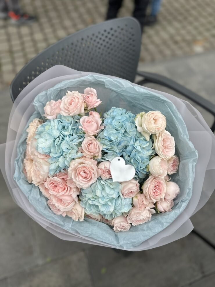 В складі букета блакитна гортензія та ніжно рожева кущова троянда.