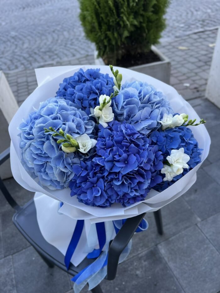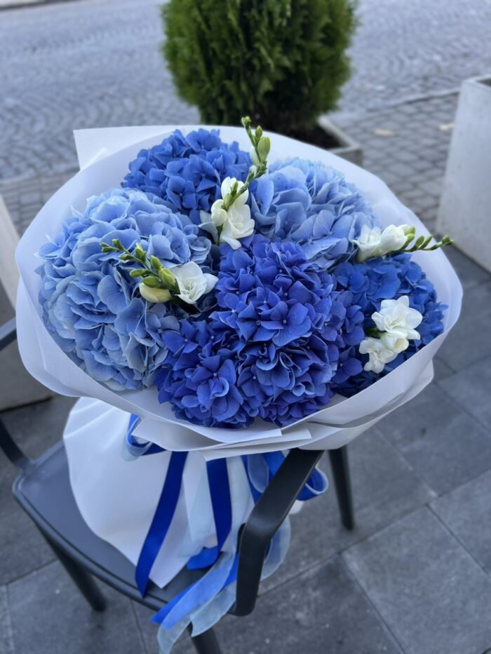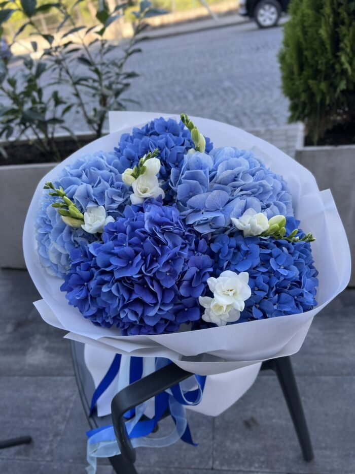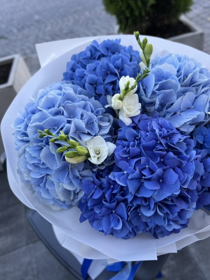 Букет з синіх та блакитних гортензій з додаванням пахучої фрезії .