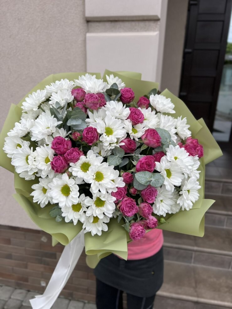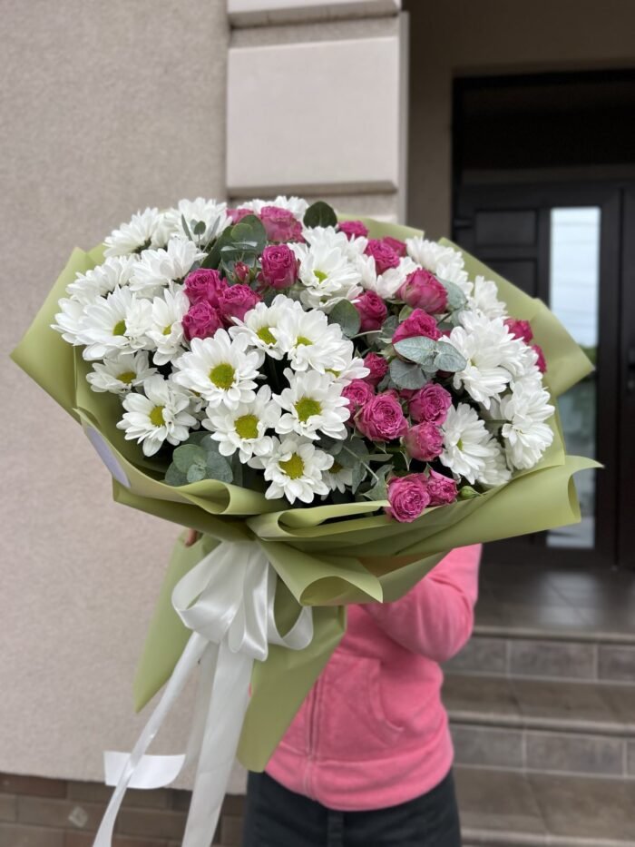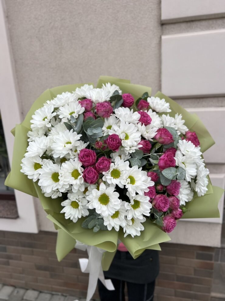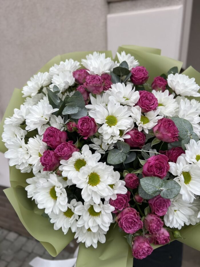 Милий букетик з хризантеми, евкаліпту та кущової троянди в упакуванні салатового кольору.