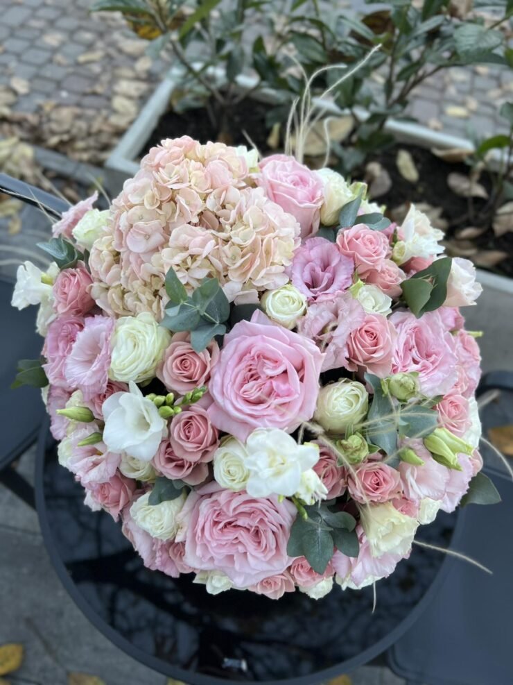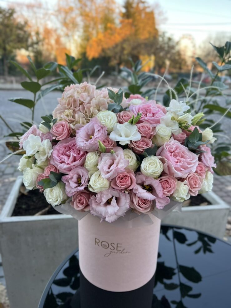 Ніжна коробочка мікс В складі коробочки : гортензія,кущова троянда,тюльпан,еустома,евкаліпт,пахуча троянда Вайт Охара