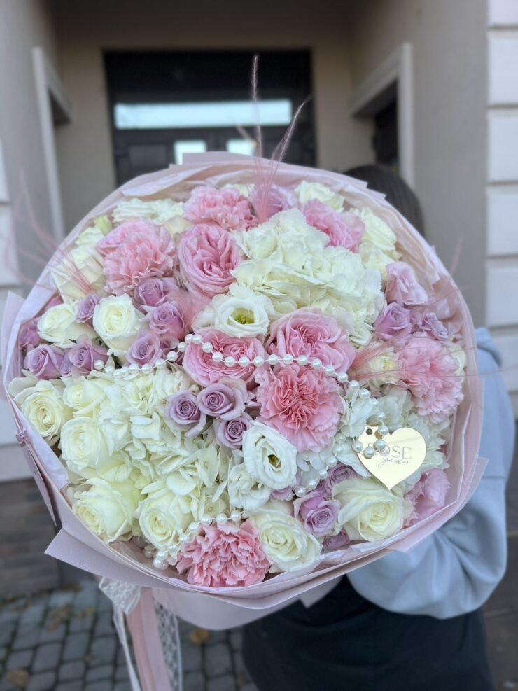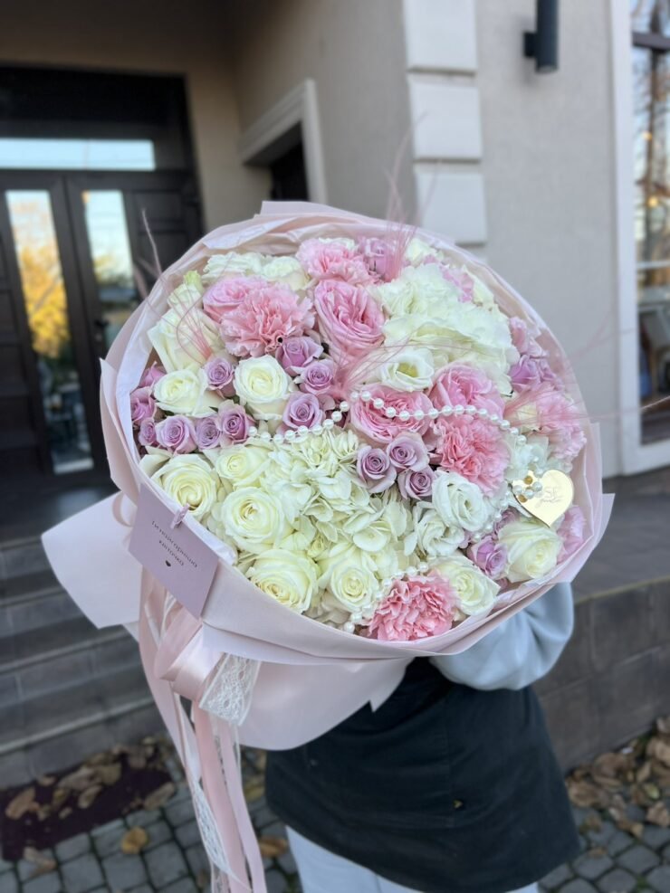 Ніжне поєднання гортензії,кущової троянди,еустоми та білої троянди .