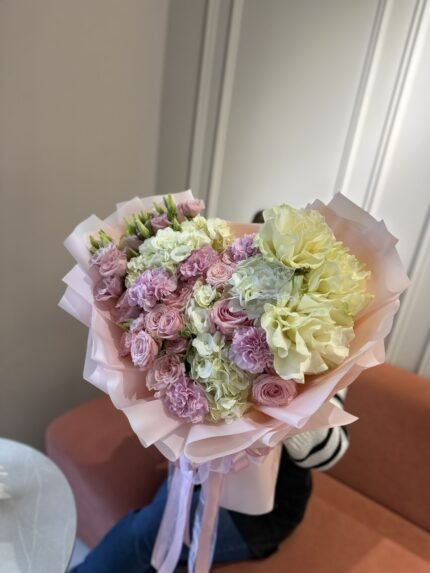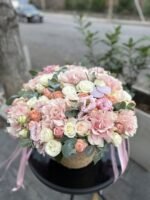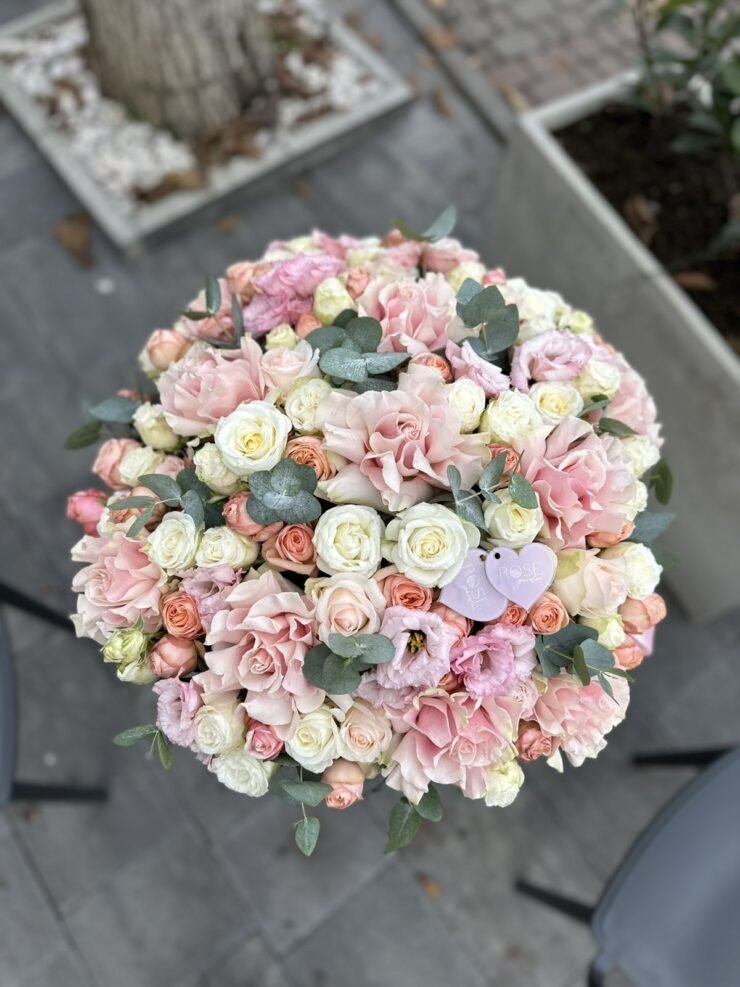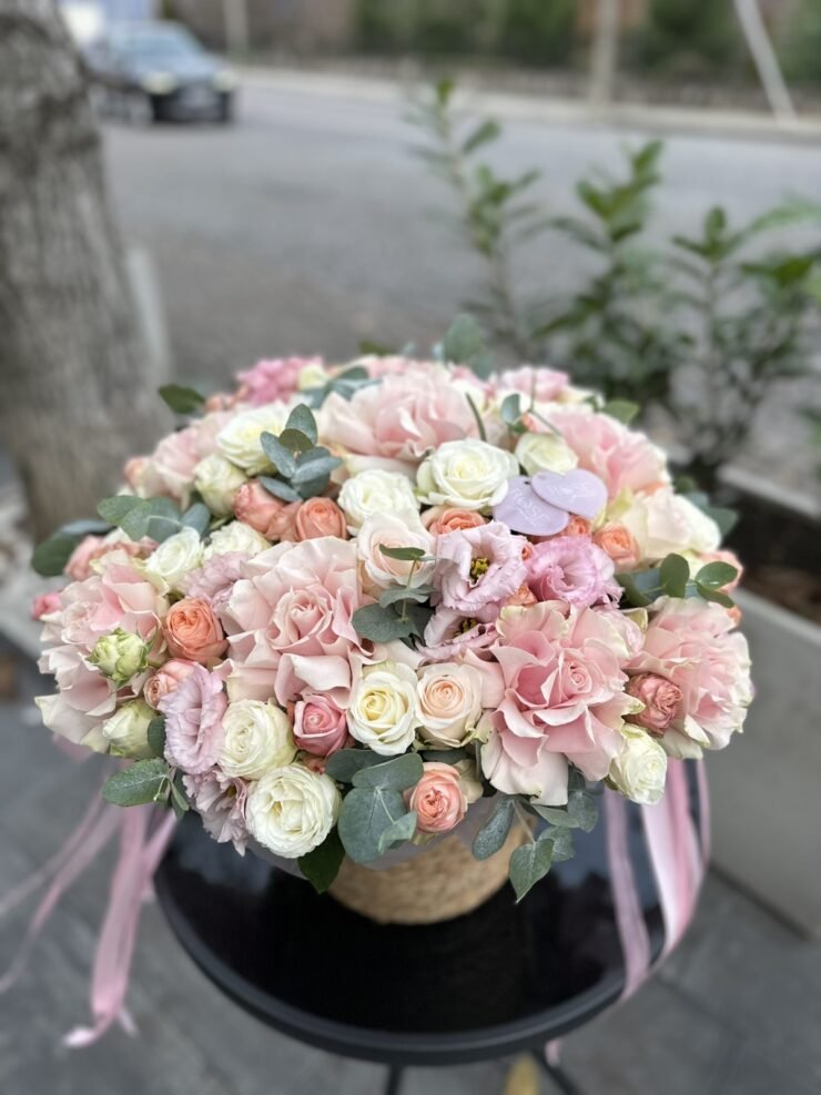 Ніжні троянди в поєднанні еустоми та евкаліпту в плетеній корзинці.