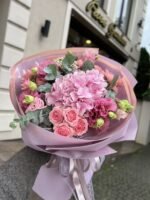 Ніжний мікс букет з гортензією,кущовими трояндами, еустомою та евкаліптом з озотамусом.