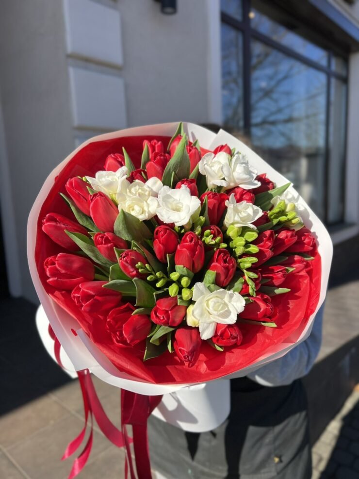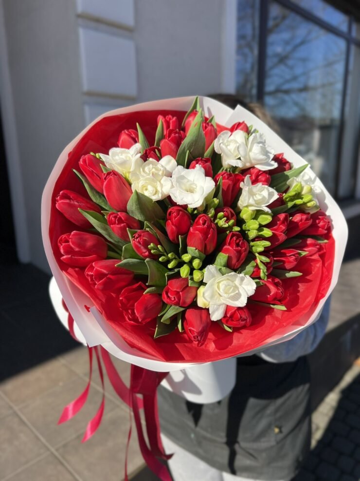Червоні тюльпани в поєднанні з пахучою фрезією.